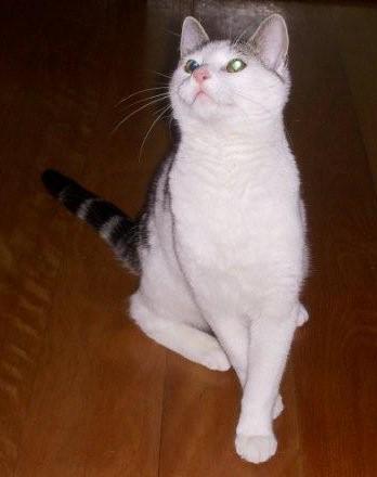 She is white with a small grey patch on the top of her head and large round eyes. Because of her colour she will need to be an indoor cat. Cats with pink noses/ears are more susceptible to sunburn. Repeated sunburn can lead to skin cancer, so it will be important to make sure that Meg is not left outdoors in the sun for long periods.