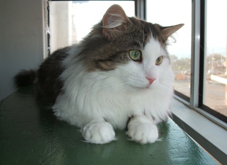 Her carer says Meg is very sweet natured and gentle. She will sit in your lap although whilst pregnant she used to spill off. She loves having her belly rubbed and has a good appetite. She is a very good looking cat and will make a wonderful pet once the kittens are weaned.
