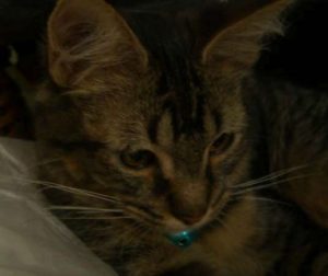 On Monday morning 17th December, a couple on their way to work travelling through rural Rossmore observed a 4 wheel drive throw a bag out of the car window then carefully reverse over it. Sensing something suspicious they were close enough to jot down the rego number before the vehicle sped off and the couple rushed to the bag to find,to their horror, 3 crushed kittens inside, the 4th kitten a tiny 6 week old male had only sustained minor injuries to his feet because of his position in the bag.