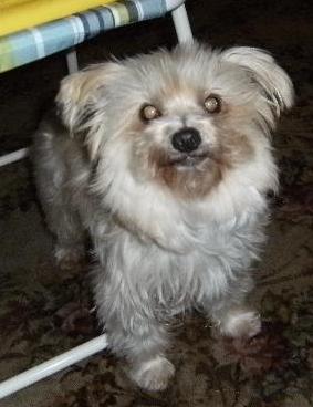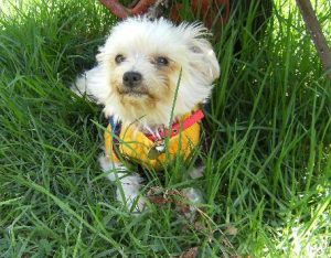 GOLDIE the 8 year old boy is a little bigger than a mini poodle but a little smaller than a cocker spaniel, he seems to be crossed with a Maltese as he has a Maltese type coat which is white with apricot points on ears. He is with a foster carer in Dolans Bay